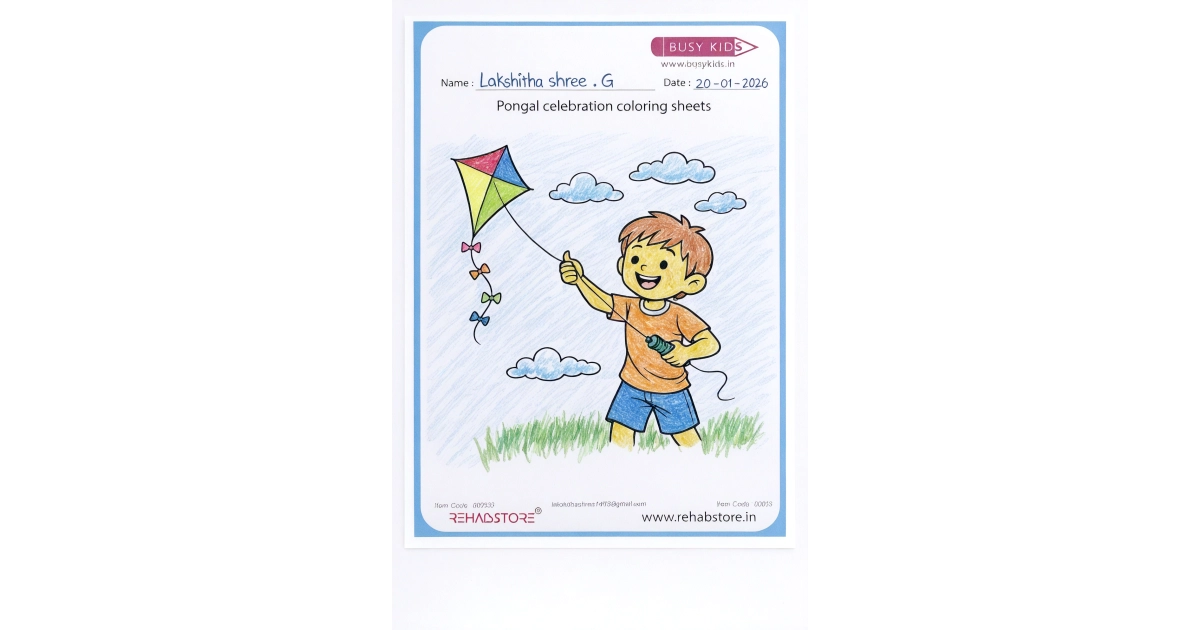 This volume presents complete Pongal celebration scenes, including traditional Pongal cooking near the house, sugarcane harvest, kite flying, bullock cart rides, festive music, and intricate kolam decorations with lamps. The pictures contain richer details and backgrounds that encourage planning, neat colouring, and visual sequencing.